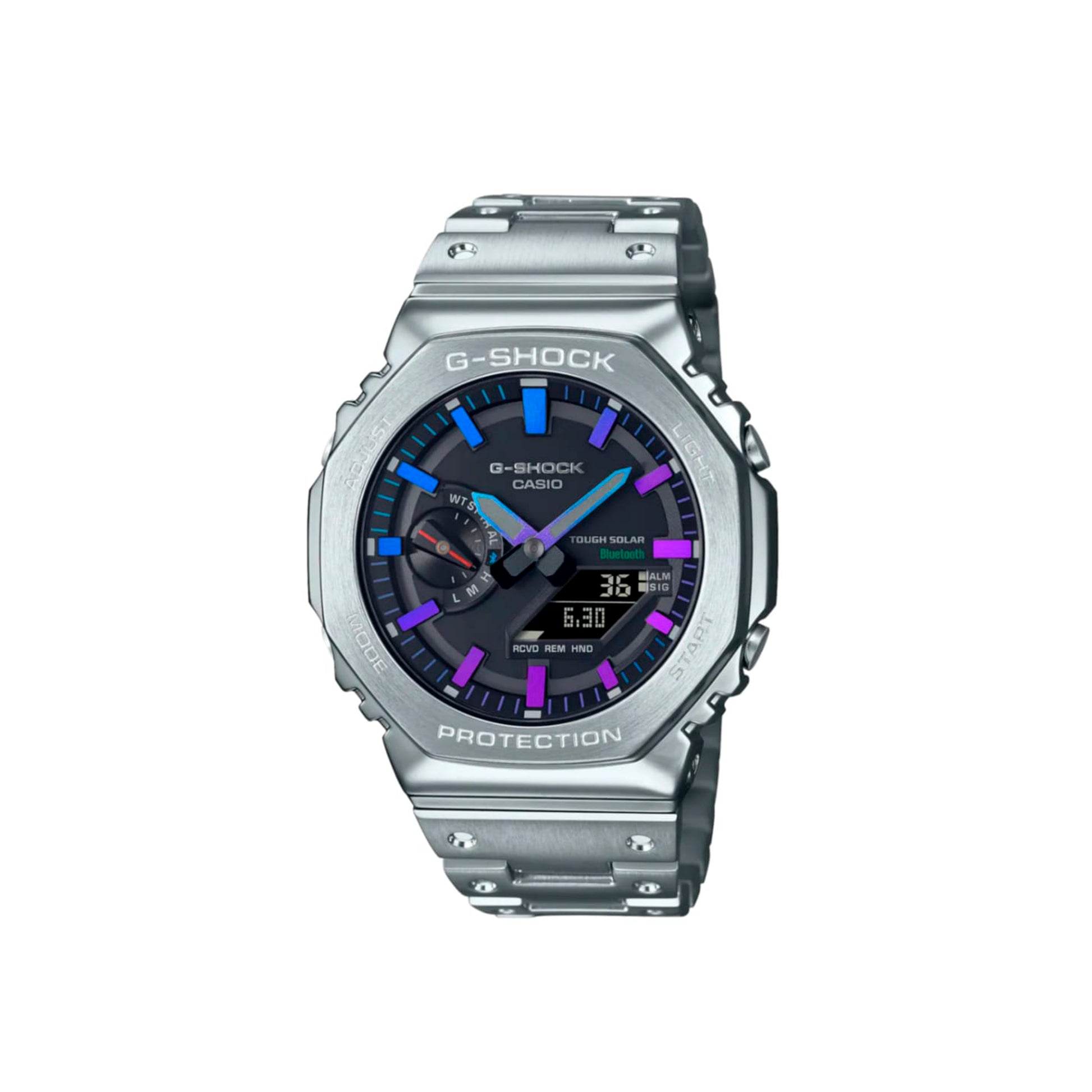 Design: Features the iconic octagonal shape of the 2100 series, inspired by the first G-Shock, the DW-5000C from 1983. The case, bezel, and band are made of stainless steel, with a finish that combines polished and brushed surfaces. Details on the dial, such as the indexes and hands, display a gradation of purple and blue, with touches of red and green. Materials: Made entirely of metal, giving it a robust and elegant appearance. The crystal is mineral and features an impact-resistant structure to protect the internal module. Functions: Water resistant to 200 meters. It incorporates Tough Solar technology, which allows solar charging, and Bluetooth connectivity to sync the time and other functions with a smartphone. Dimensions and Weight: The case measures 49.8 × 44.4 × 12.8 mm and weighs 165 grams. Special Edition: This model is part of a special edition for G-Shock's 40th anniversary, standing out for its colorful design and metal construction.