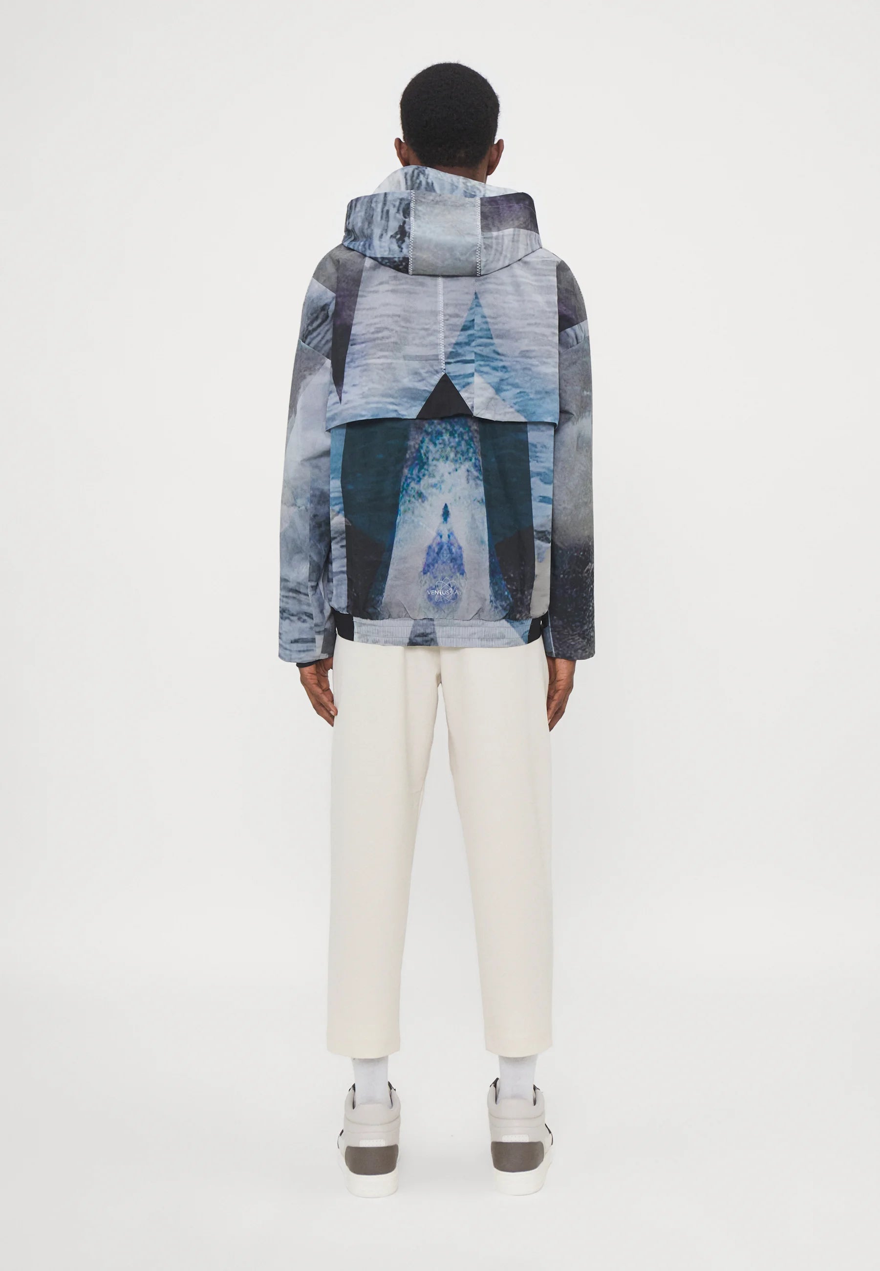 It is a lightweight windbreaker-style jacket, featuring functional details (hood, full zipper, pockets) and a striking printed design.