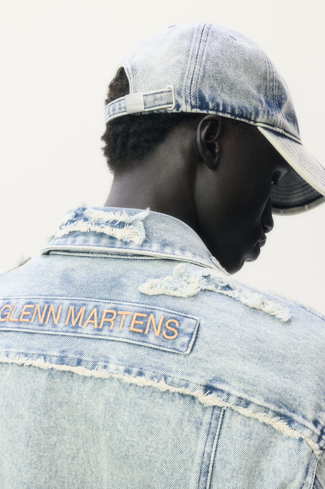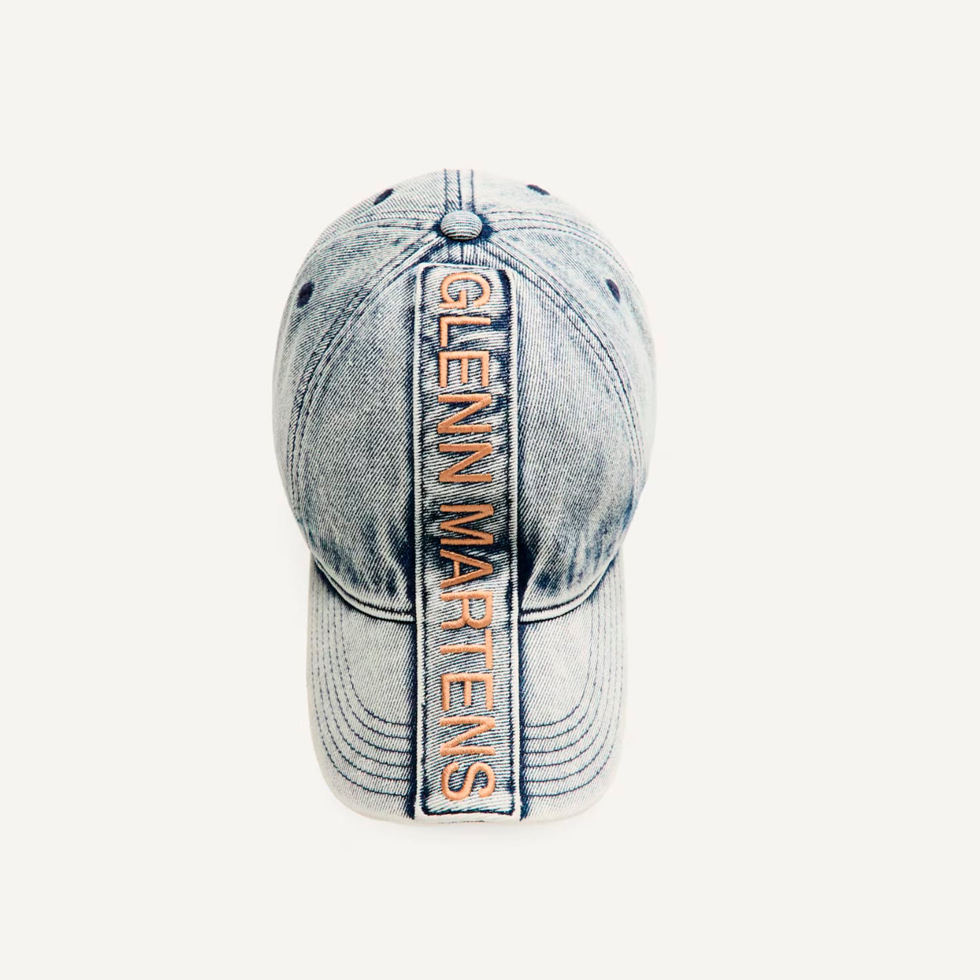 Rigid cotton denim cap with a washed-out appearance. Features a sharply curved visor and a cotton sweatband. Embroidered logo patch on the front and an adjustable strap with a metal buckle at the back, both featuring the designer’s logo.