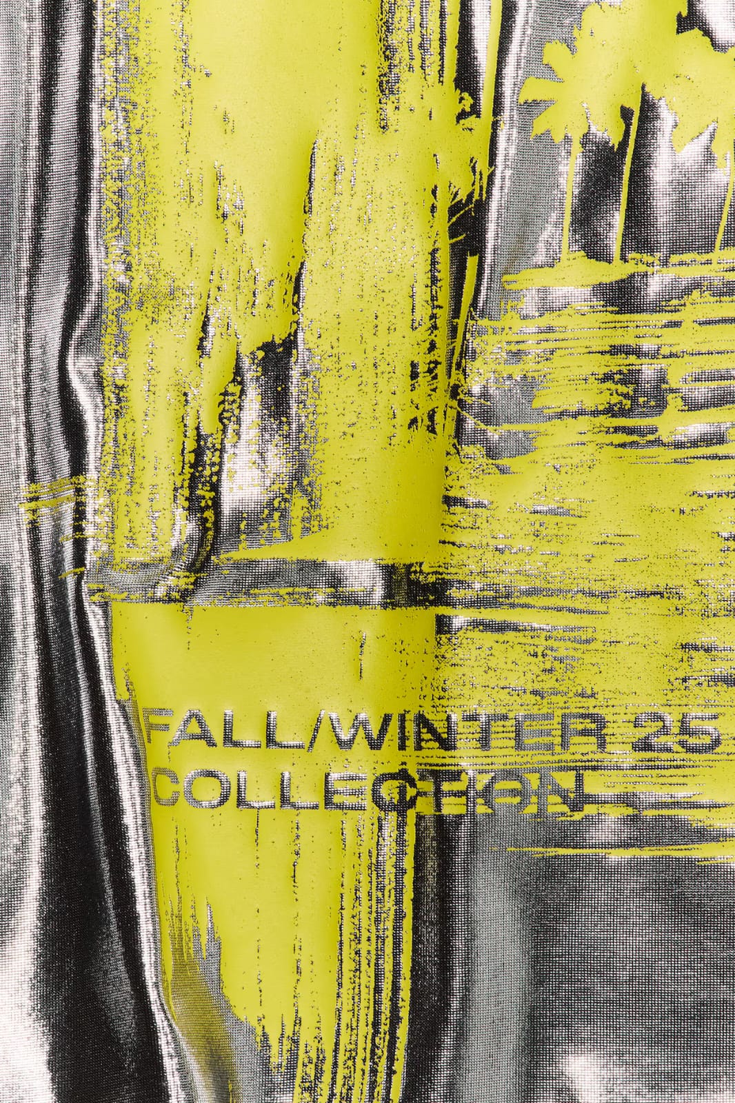Short fitted jersey top with a shiny metallic coating. Features a printed designer logo on the front.