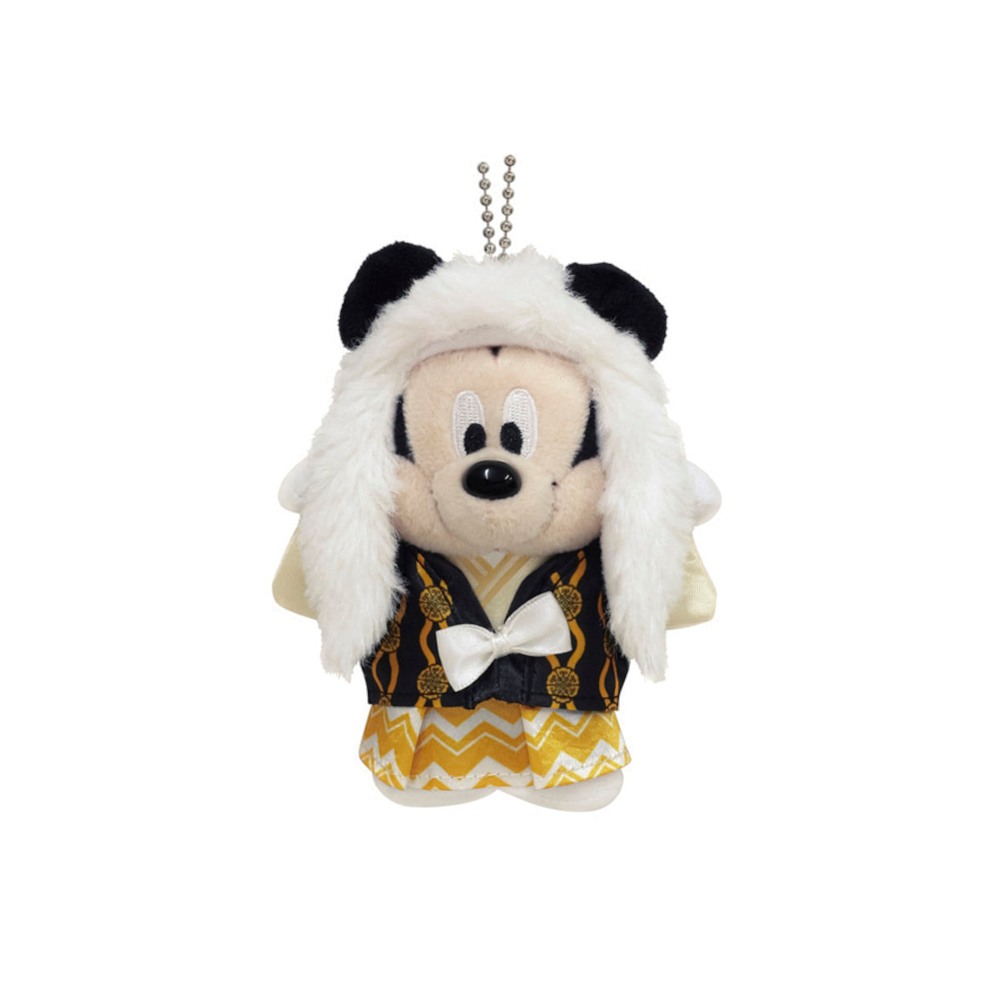 Mickey viste un traje tradicional oriental con detalles dorados y una capucha de peluche blanco que representa una mezcla entre estilo ceremonial y festivo. Fabricado con materiales suaves y de alta calidad, incluye una cadena metálica tipo bolitas para colgarlo en bolsas, mochilas o llaves.