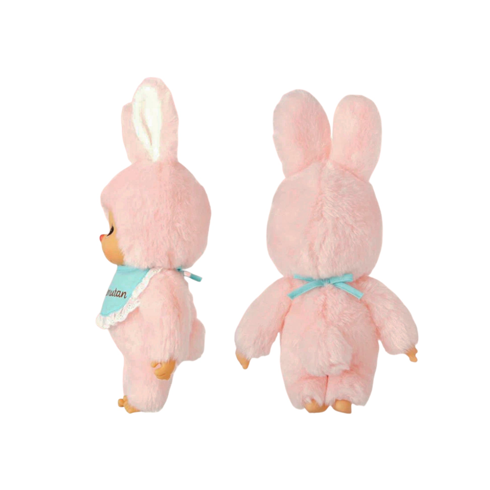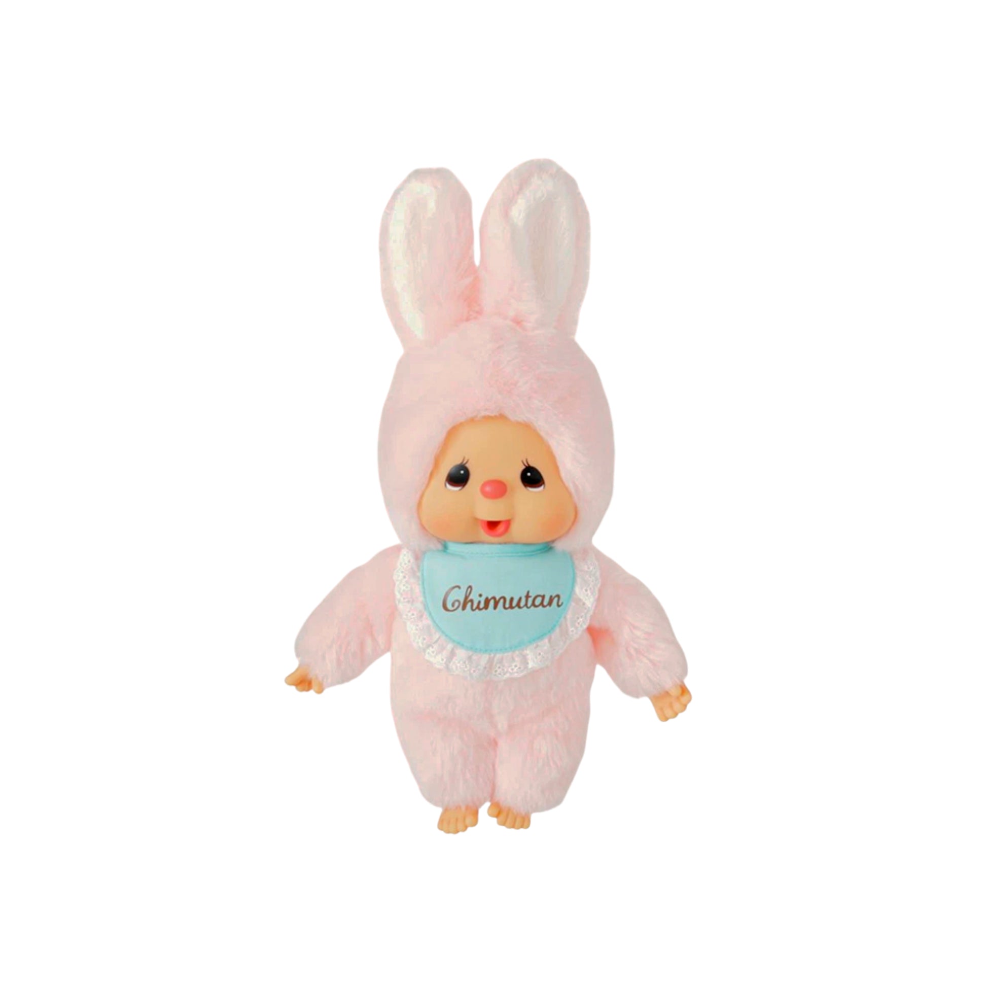Chimutan is a beloved character created by Sekiguchi, dressed in a fluffy pastel pink bunny suit with long ears and a soft body. The doll features an adorable baby face, embroidered details, and a blue bib with lace edges that reads “Chimutan.”