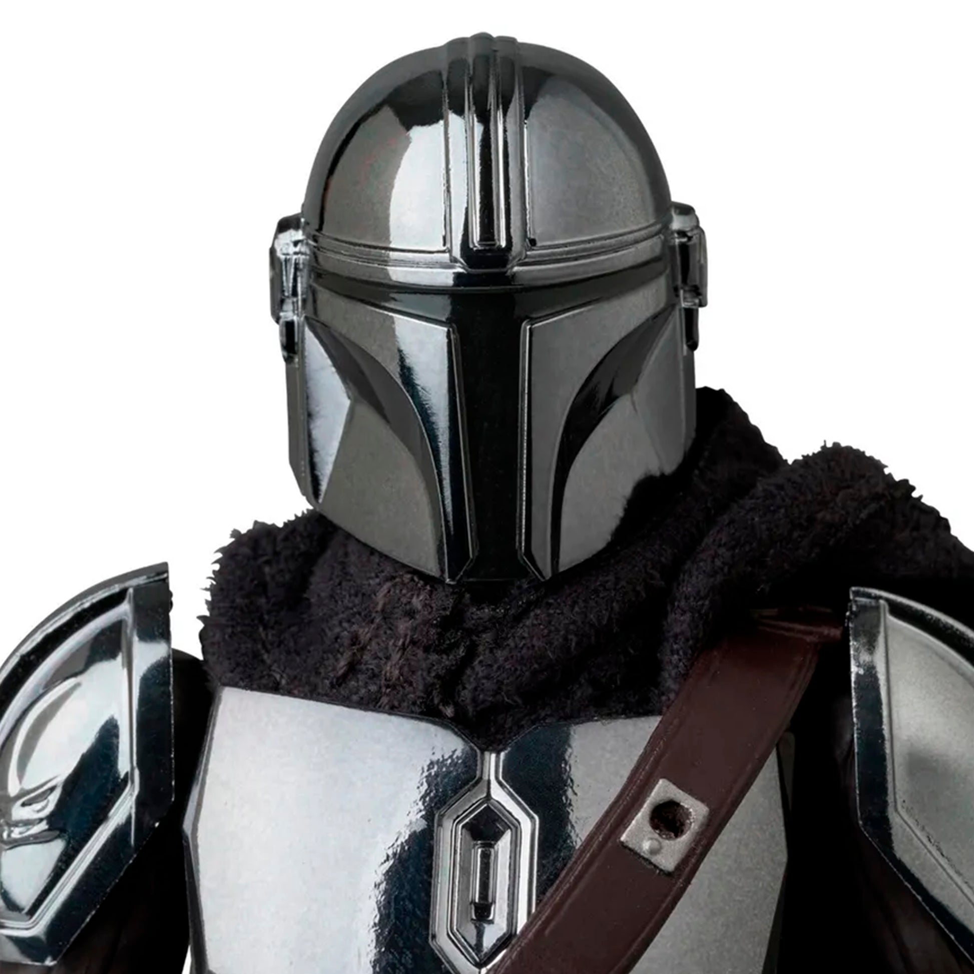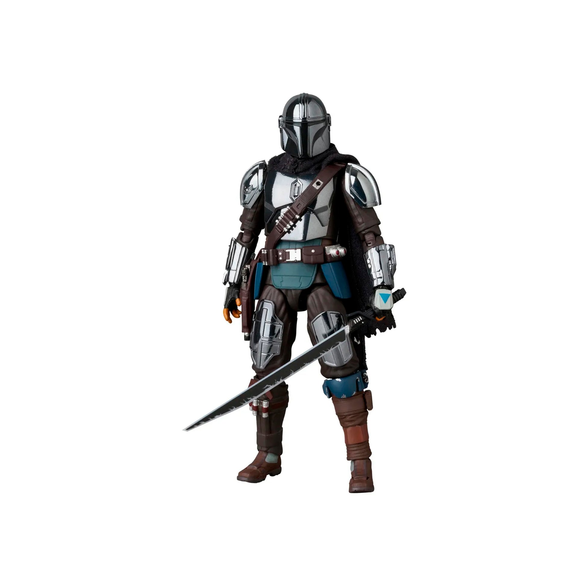Medicom Toy presenta la figura MAFEX No.256 The Mandalorian (Versión Cromo), una edición limitada totalmente articulada en escala 1/12 de la serie Star Wars: The Mandalorian. Esta versión cromada incluye armadura Beskar bañada en cromo, reproducida con acabado brillante característico. La figura mide aproximadamente 160 mm de altura. Viene con dos cabezas intercambiables, la figura de Grogu, varias armas (bláster, lanza Beskar, Dark Saber, entre otras), jetpack con partes efecto y una base / soporte móvil.